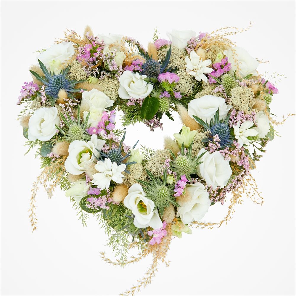 Een prachtig rouwstuk in de vorm van een hart: Rouwboeket Eeuwig hart. Dit rouwstuk past perfect bij een afscheid met aandacht voor natuurlijke bloemen, bijzondere grassen en droogmaterialen. Het frivole en uniek samengestelde rouwstuk in hartvorm is voorzien van pastelkleurige bloemen en een speciale hartvorm, waardoor Eeuwig hart een schitterend rouwboeket is voor een emotioneel afscheid. Beschikbaar in 25cm of 65cm formaat. Bij iedere bestelling met rouwwerk controleren onze klantenservicemedewerkers persoonlijk en handmatig, om zo te garanderen dat het rouwstuk volledig aan jouw wensen voldoet. Onze bloemisten bezorgen de rouwbloemen op elke gewenste locatie, waaronder kerken, rouwcentra of crematoria. Je hoeft het rouwstuk niet zelf op te halen, onze bloemisten zorgen ervoor dat het rouwboeket op het juiste moment wordt bezorgd en dat de bloemen op hun mooist zijn. Een geruststellende gedachte tijdens deze moeilijke periode.